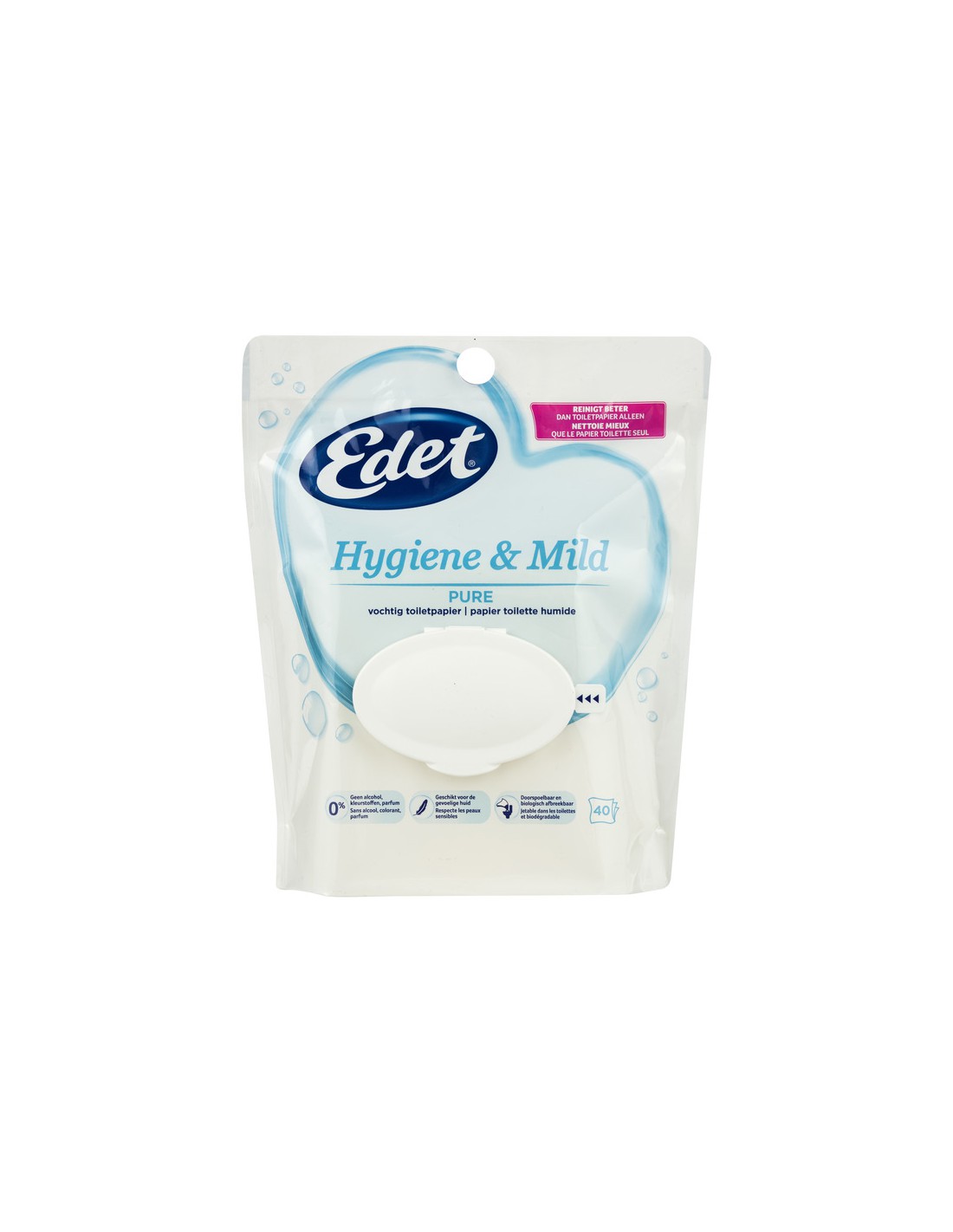 Nawilżany papier toaletowy ma łagodną strukturę odpowiednią dla wrażliwej skóry. Zapewnia uczucie czystości i świeżości. Edet Pure to połączenie miękkości i wytrzymałości.